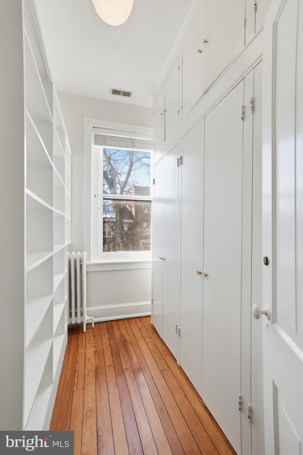 Sunlight pours through the home thanks to its east-west exposure, illuminating heart pine floors and beautifully scaled living spaces throughout the day. The living room is enhanced by custom built-ins and bespoke Stark carpeting, creating a warm yet polished setting ideal for both everyday living and entertaining. A full bath on the main level adds flexibility, while the upstairs full bath has recently been updated, clad in marble and includes a heated towel rack for a touch of quiet luxury.